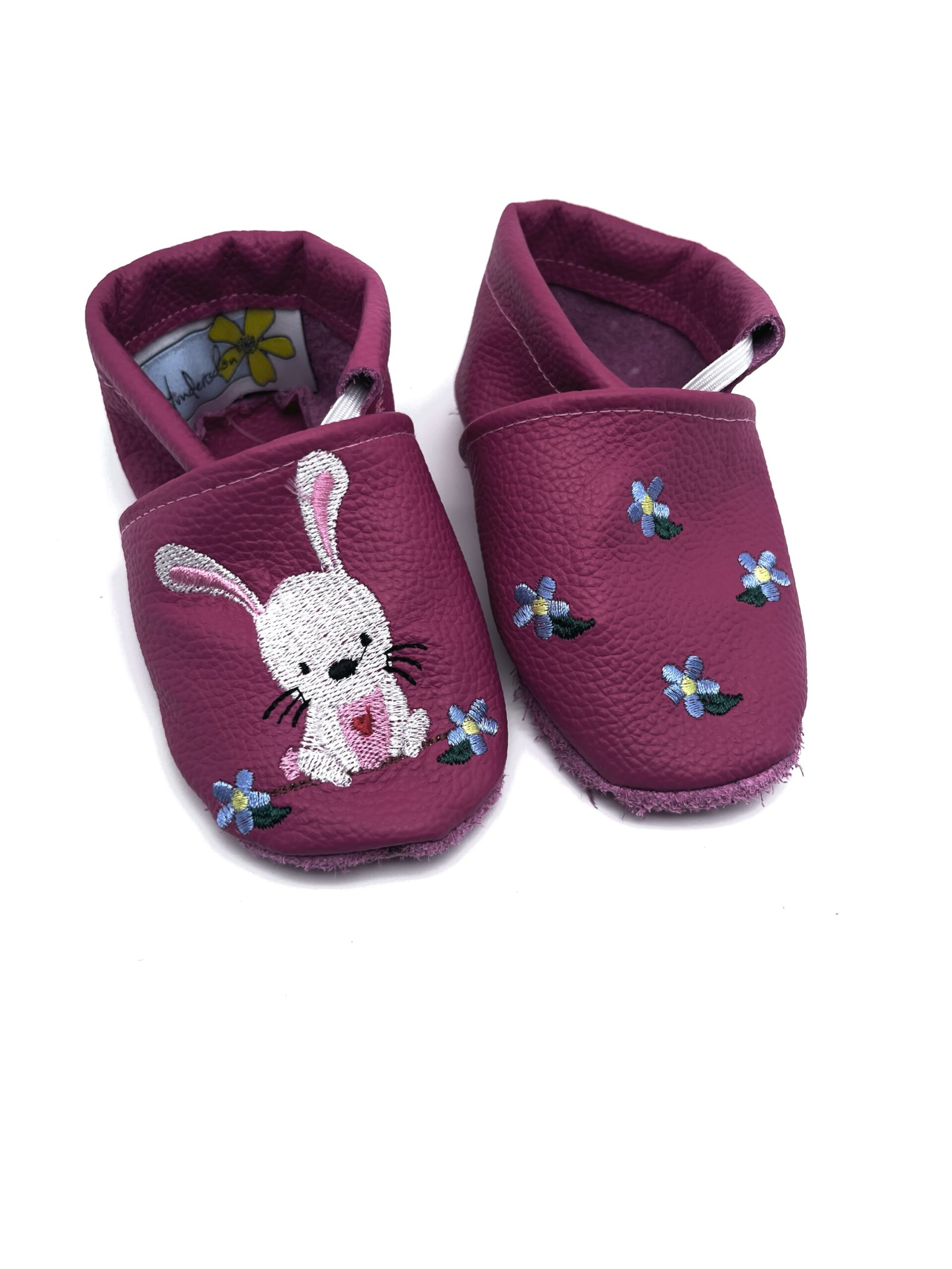 Vorgefertigte Lederpuschen in Größe 19 mit Hasen Motiv. Farbe Spann magenta , Farbe Ferse magenta.