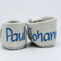 • die Puschen werden von Ihnen selbst angepasst, das heißt: der Gummizug im Fersenteil wird beim ersten anziehen verknotet und im Fersentunnel versteckt. Dadurch können Sie selbst entscheiden wie weit der Gummi sein muss.